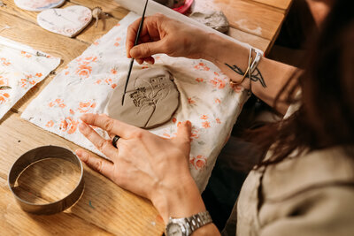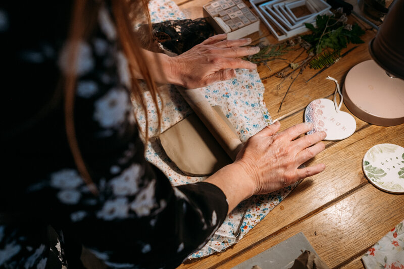 I host fun and creative pottery workshops, using dried and fresh plants, fabrics and letter stamps pressed into the clay, to achieve some amazing results. We make a variety of flat pieces, such as coasters, tiles, hanging decorations and also a trinket dish