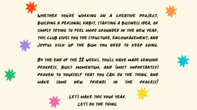 Whether you’re working on a creative project, building a personal habit, starting a business idea, or simply trying to feel more grounded in the new year, this club gives you the structure, encouragement, and joyful kick up the bum you need to keep going.