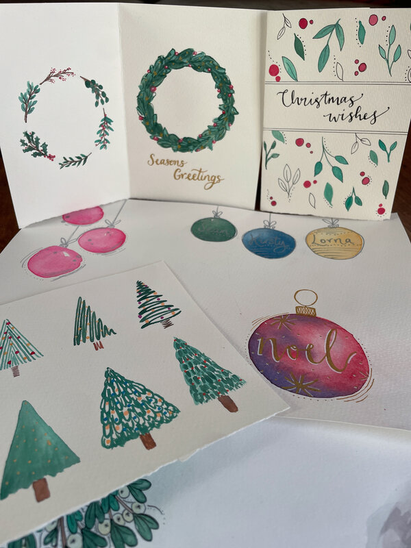 A collection of your own hand-painted Christmas cards, on lovely watercolour card stock, with envelopes