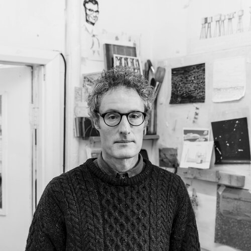 Simon studied painting at Portsmouth and printmaking at Chelsea College of Art, where he won the British Institution Fund Award. He remained in London after leaving university and worked as a scenic painter and muralist. He moved to Bristol in 2002. He works as a printmaker, illustrator and teacher of screen printing.